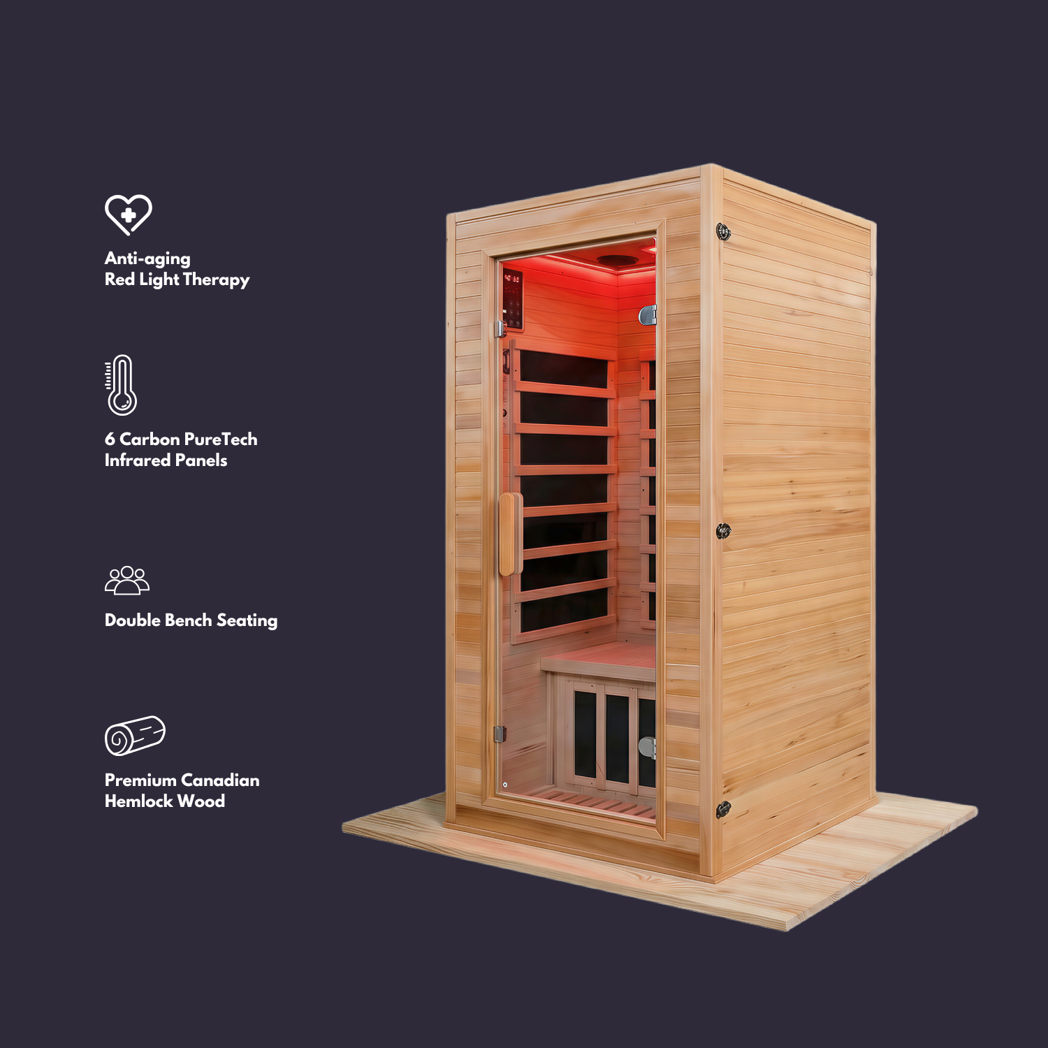 Our sauna features a far infrared heating system powered by 6 Carbon PureTech™ panels, designed to deliver deep, even heat that warms the body from within for a comfortable and effective sauna experience. From near, mid, and far infrared, a complete spectrum of heating for your body.